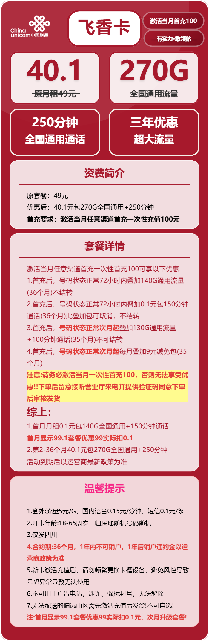 4. 首月扣费: 电信首月免费,联通大部分按原套餐折算,移动全月全价扣费。每款产品扣费有差异,具体以产品详情为准。