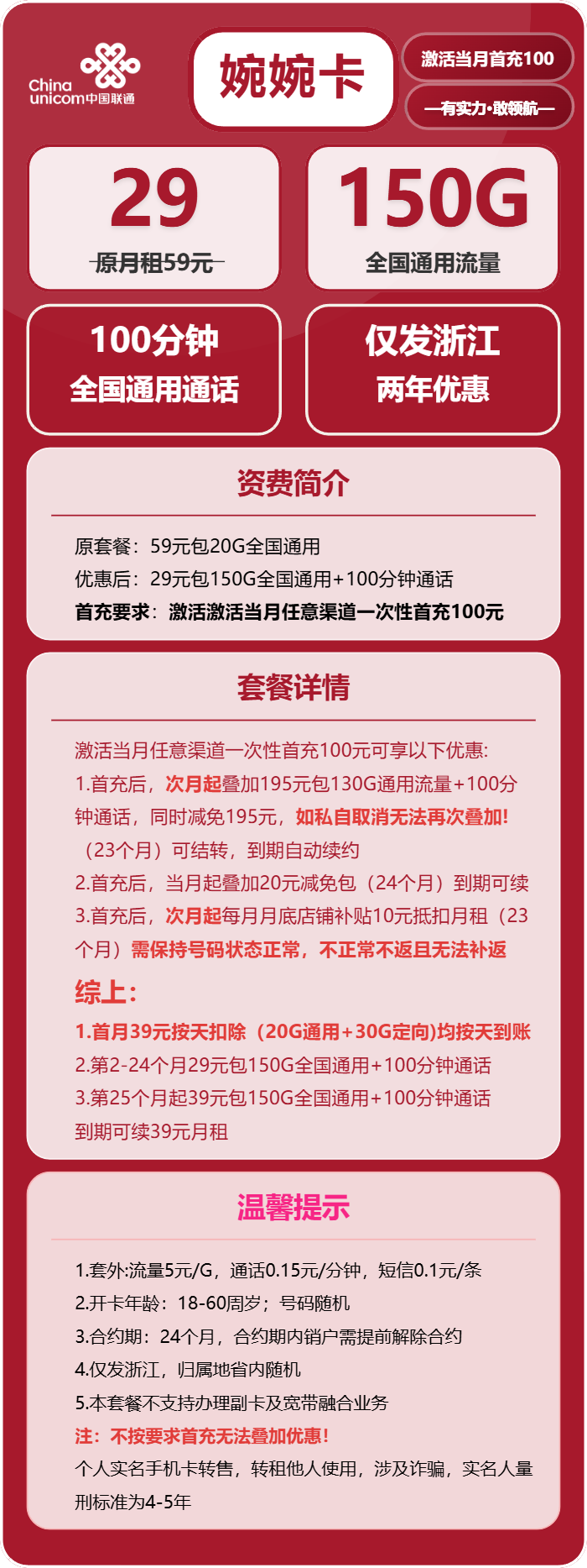 4. 首月扣费: 电信首月免费,联通大部分按原套餐折算,移动全月全价扣费。每款产品扣费有差异,具体以产品详情为准。