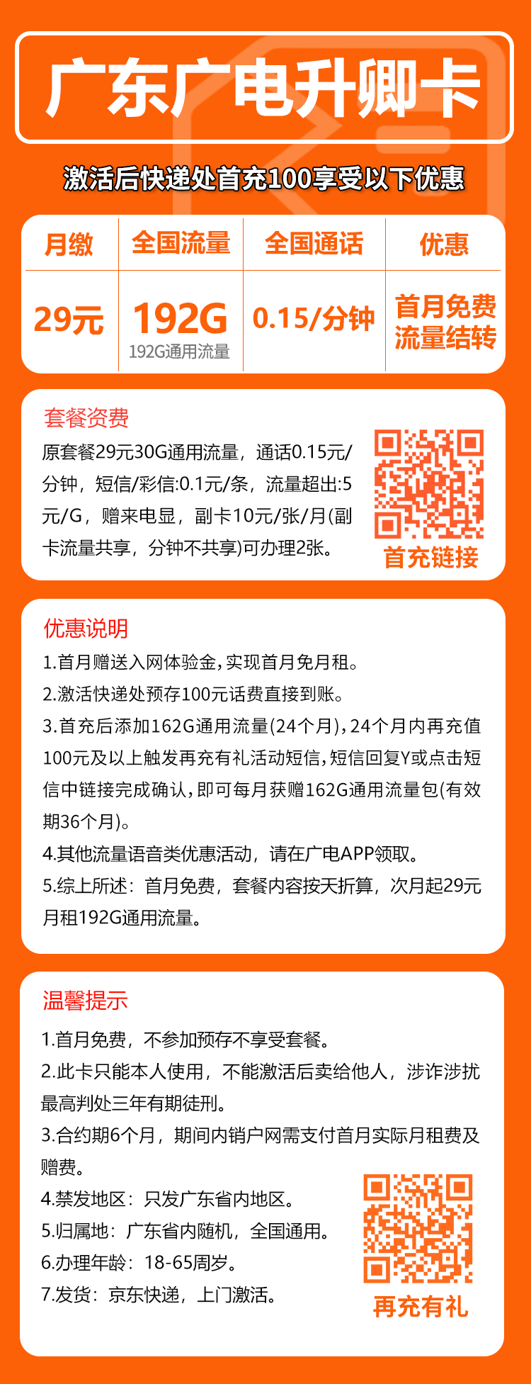 资费:29元包192G通用+通话0.15元/分钟