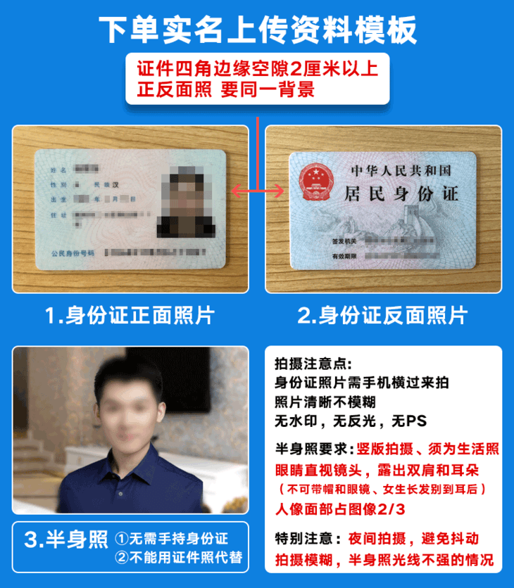 1、请拍摄身份证原件禁止翻拍、扫描件、旧照片;拍摄无反光、字迹清晰完整,四角边框全部露出。